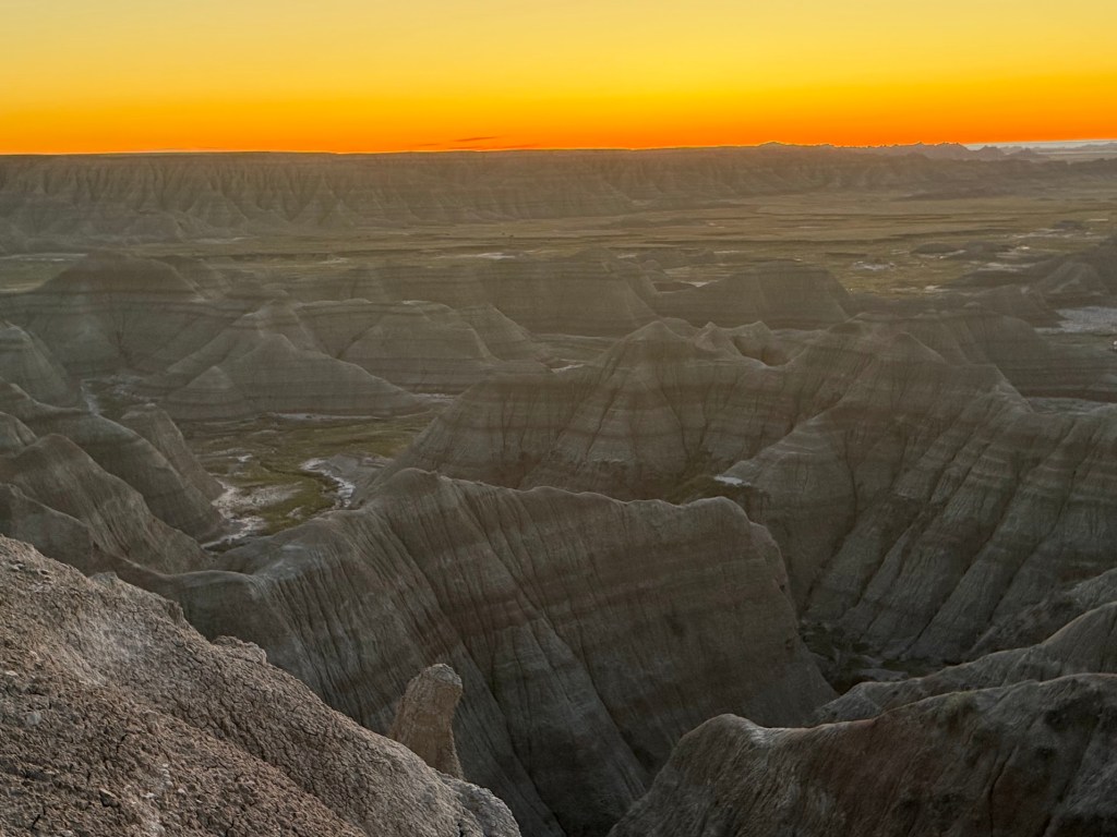 Soon the sun came up, its golden light flooding the alien landscape of the Badlands. Others wandered the cliff where we stood, some taking photos, some just watching. One man kept trying to complain to me that there were no bathrooms open. I told him he could hide in any of the natural canyons around him. Even if he just went in the open 35 degree tundra, who would be around to stop him. He walked away, leaned against the hood of his car, and shook his head, probably peeing his pants.