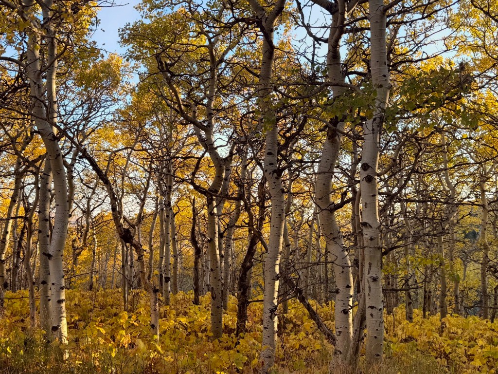 When the sun hit the side of the mountains, I FaceTimed Rachelle and the yellow aspens dotted the space between the tall firs, spruce, and larch. White foggy clouds blanketed the water below us, drifting with the whipping air from the deep hidden valleys beyond the illuminated spires. Silence filled our periphery, and a peaceful slow scene unfolded before us.
