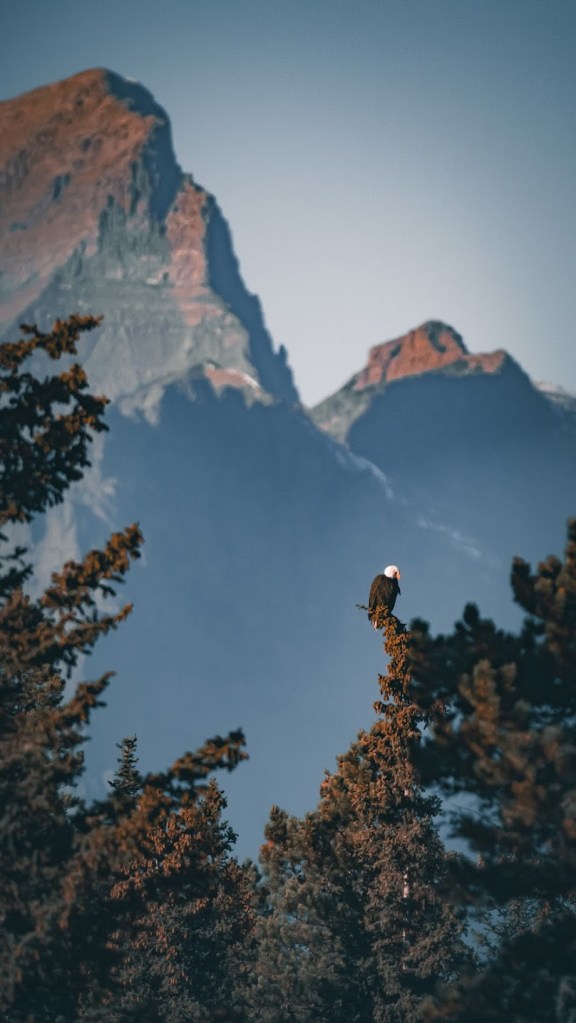 Aspens in the fall in Glacier are the incarnation of angels from the deep reaches of heaven where beauty is abundant, clear, and necessary. I stumbled through the stands on the side of the highway, floored with waves of numen on the way to Many Glacier. Chris searched for the Perfect Wood in the underbrush, and a lone bald eagle, perched upon a fir with the grey peaks behind it, waited just long enough for us to say hello before he took off to his secret eagle life.