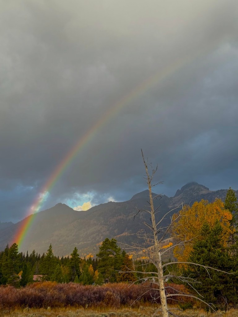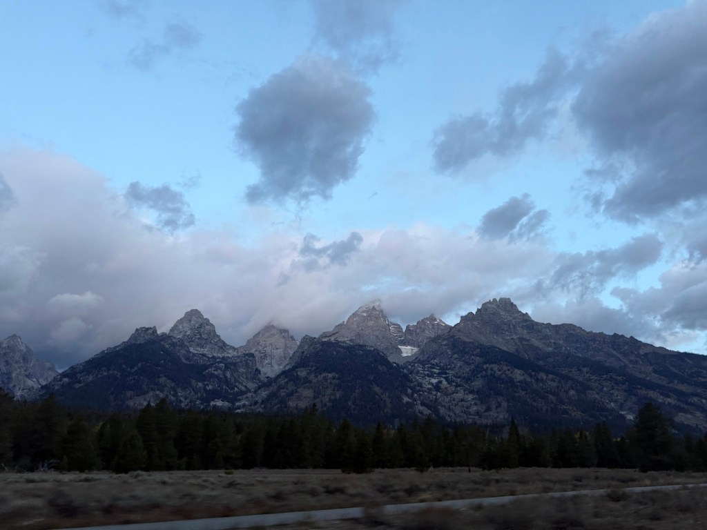 When we finally put gas in the tank, my car had twenty three miles before empty. Dawn threatened to blast away the wispy small rain clouds, but the clouds had better plans. At Jenny Lake, we positioned our cameras and waited for the sun to shine on the Tetons. While we captured some great shots, we had to accept that our deadline for beelining home was here and we needed to leave. We packed our cameras up in the Prius one last time and the sun shone down where we had hoped, a rainbow faintly dancing in front of it.