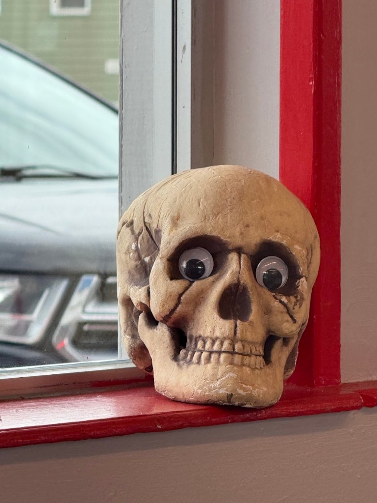 We played D&D to pass the time, I DMing, and Chris, a lone adventurer destroying orcs and ogres in an ancient chapel. The hours slipped between our sentences and imagination, stopping only to eat salty “cheese wheels”, a moronic midwest invention of a cheeseburger, wrapped in cheese, battered, and deep fried. The only good thing about this place was the skull with googly eyes.